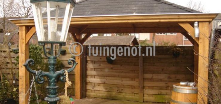 Een vrijstaande eiken houten prieel. De zinken goot heeft een eiken houten omlijsting en loopt rondom door. Dat is een specialiteit van Tuingenot.