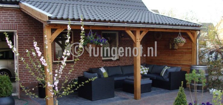 Lariks schaaldelen houten veranda. De dakpanplaten lopen naadloos over in het dak van het huis. Hierdoor lijkt het een mooi geheel. Specialiteit van Tuingenot die belangrijk vindt dat uw veranda past bij uw huis.