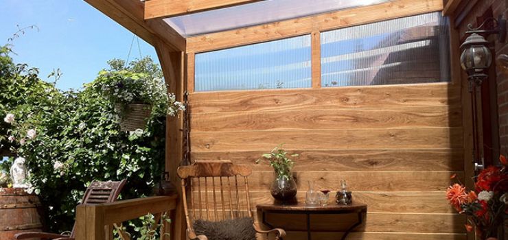 Eiken veranda, zijkant potdeksel lariks De zijkanten kunnen op verschillende manieren uitgevoerd worden. B.v in rabatdelen, kraaldelen, glazen wanden etc etc. De houten zijwanden lenen zich uitstekend voor het ophangen van decoratiespullen waardoor de veranda gezellig wordt.